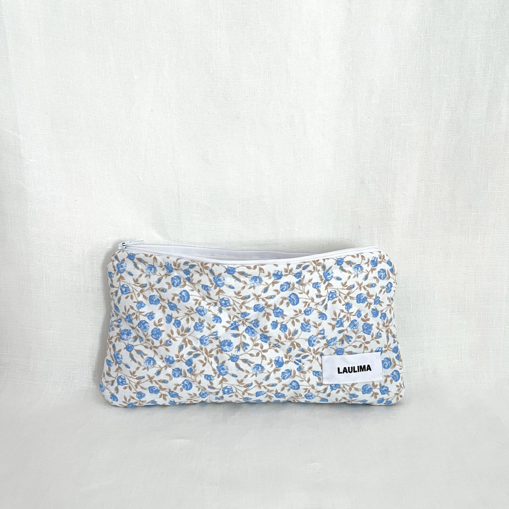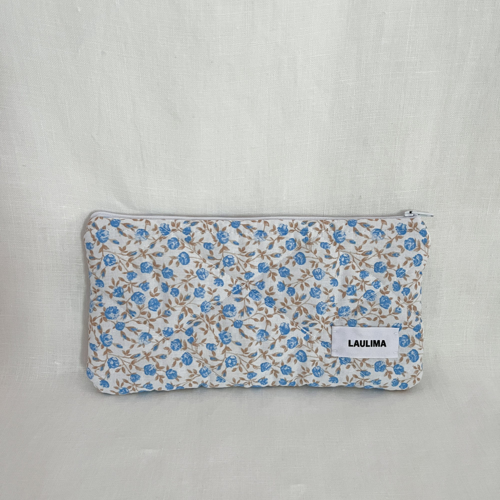 Χειροποίητο καπιτονέ νεσεσέρ από βαμβακερό ύφασμα με γαλάζια λουλούδια, ιδανικό για μολύβια ,καλλυντικά ή μικρά αξεσουάρ. Το εσωτερικό ύφασμα είναι βαμβακερό άσπρο.